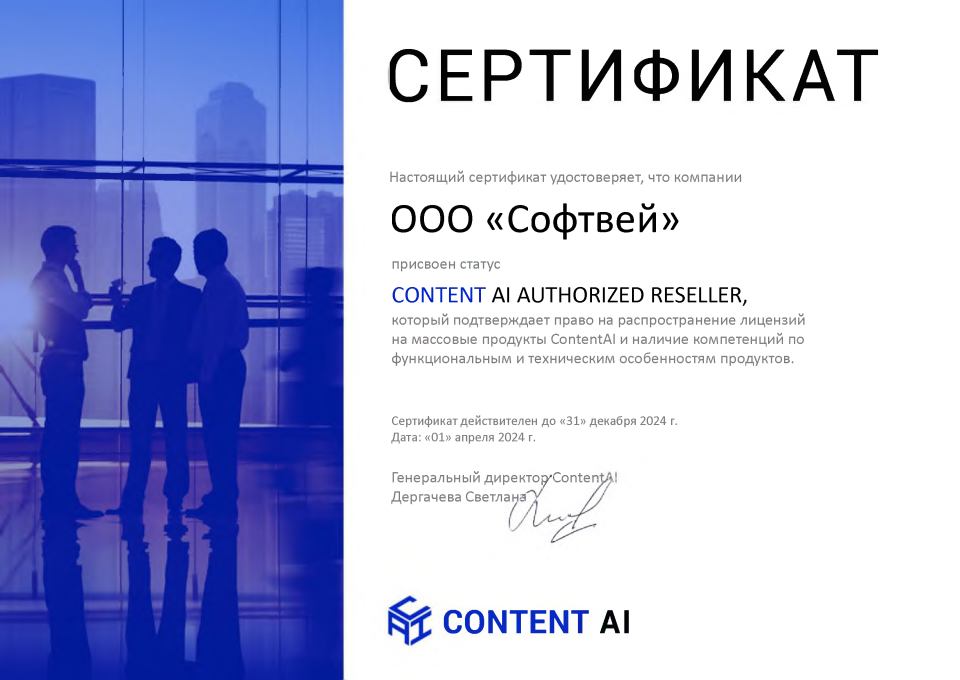 Content AI (ООО "Контент ИИ") — это российская компания, занимающаяся разработкой решений в области интеллектуальной обработки информации. Основной фокус компании - предоставление решений для автоматизации обработки документов и данных, которые востребованы на рынке более 30 лет. Продукты и услуги компании нацелены на трансформацию бизнеса, повышение эффективности процессов, а также на успех людей в работе и жизни. Content AI имеет аккредитацию Минцифры РФ.